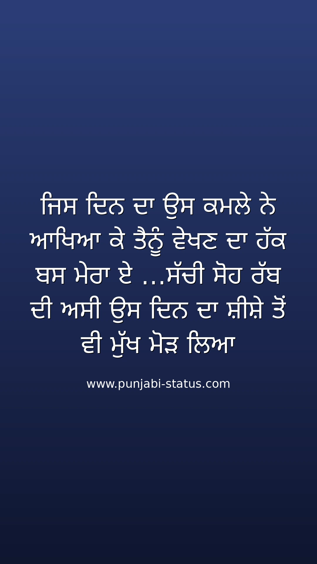 ਜਿਸ ਦਿਨ ਦਾ ਉਸ ਕਮਲੇ ਨੇ ਆਖਿਆ ਕੇ ਤੈਨੂੰ ਵੇਖਣ ਦਾ ਹੱਕ ਬਸ ਮੇਰਾ ਏ …ਸੱਚੀ ਸੋਹ ਰੱਬ ਦੀ ਅਸੀ ਉਸ ਦਿਨ ਦਾ ਸ਼ੀਸ਼ੇ ਤੋਂ ਵੀ ਮੁੱਖ ਮੋੜ ਲਿਆ