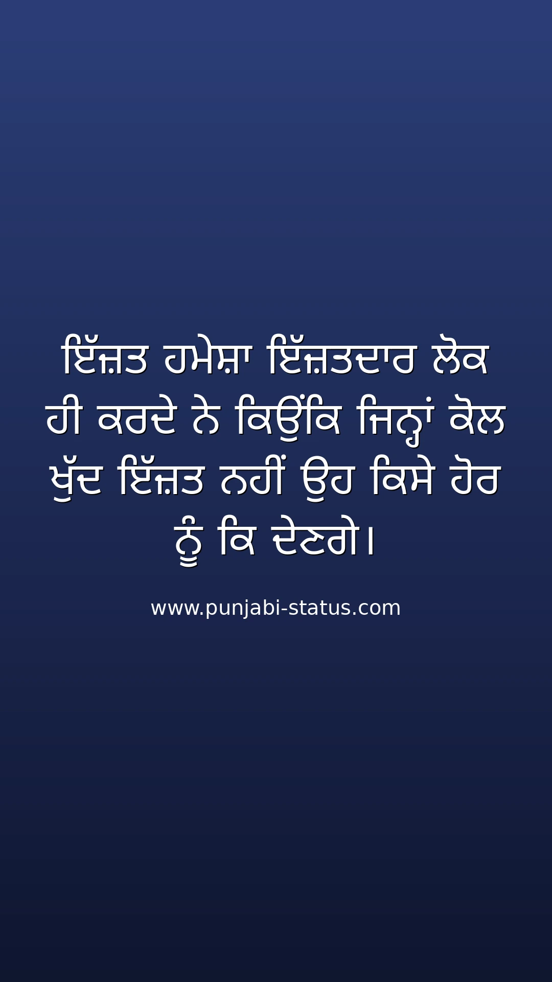 ਇੱਜ਼ਤ ਹਮੇਸ਼ਾ ਇੱਜ਼ਤਦਾਰ ਲੋਕ ਹੀ ਕਰਦੇ ਨੇ ਕਿਉਂਕਿ ਜਿਨ੍ਹਾਂ ਕੋਲ ਖੁੱਦ ਇੱਜ਼ਤ ਨਹੀਂ ਉਹ ਕਿਸੇ ਹੋਰ ਨੂੰ ਕਿ ਦੇਣਗੇ।
