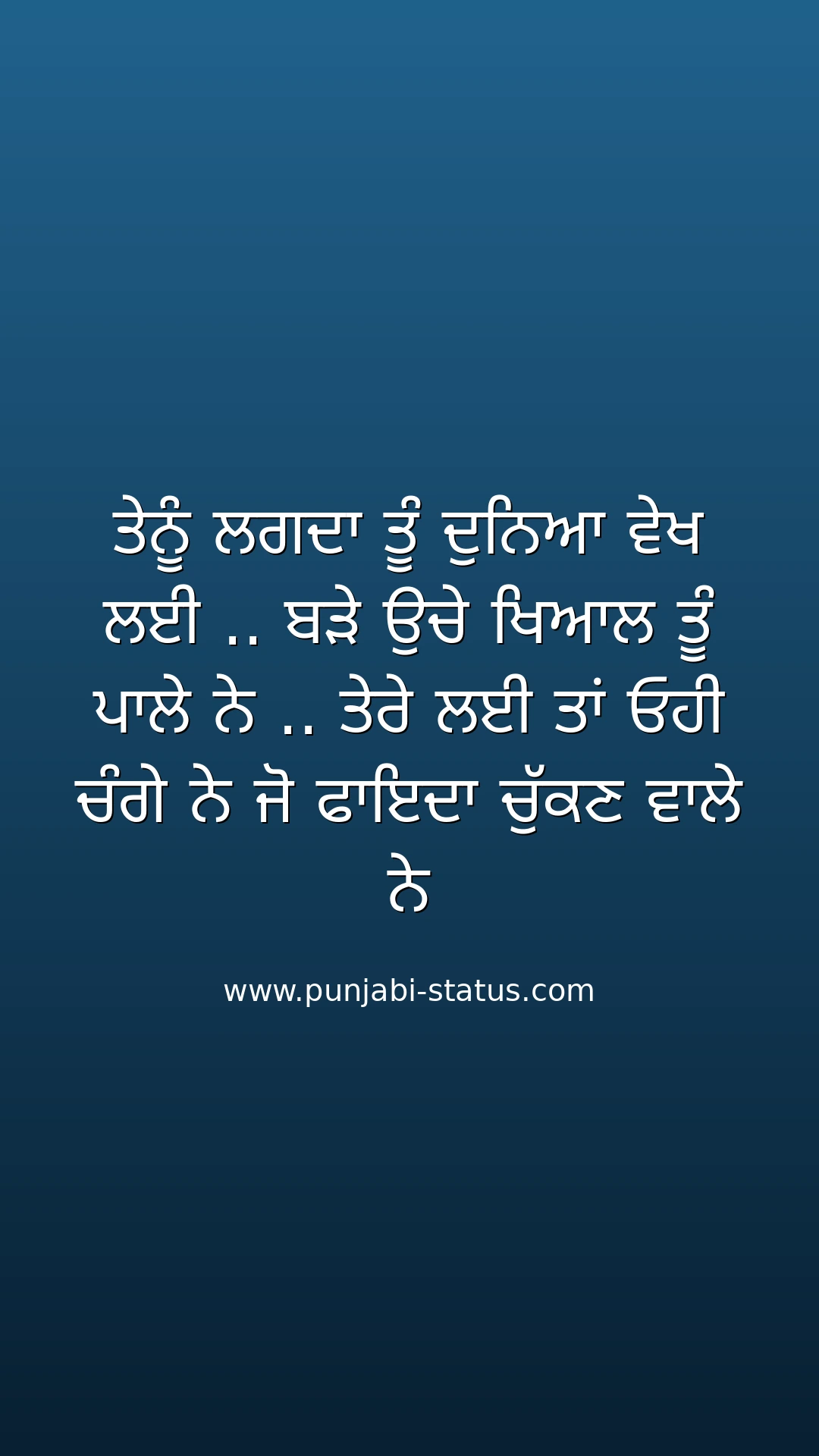 ਤੇਨੂੰ ਲਗਦਾ ਤੂੰ ਦੁਨਿਆ ਵੇਖ ਲਈ .. ਬੜੇ ਉਚੇ ਖਿਆਲ ਤੂੰ ਪਾਲੇ ਨੇ .. ਤੇਰੇ ਲਈ ਤਾਂ ਓਹੀ ਚੰਗੇ ਨੇ ਜੋ ਫਾਇਦਾ ਚੁੱਕਣ ਵਾਲੇ ਨੇ