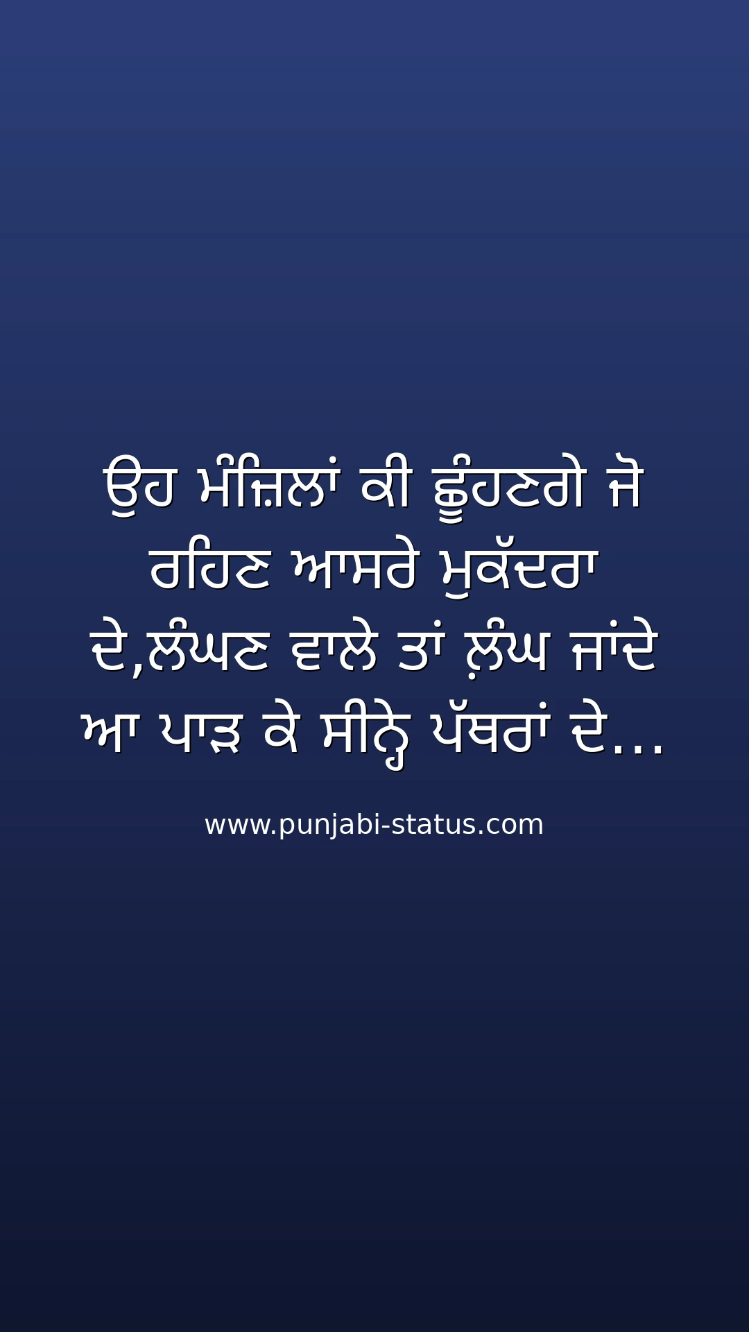 ਉਹ ਮੰਜ਼ਿਲਾਂ ਕੀ ਛੂੰਹਣਗੇ ਜੋ ਰਹਿਣ ਆਸਰੇ ਮੁਕੱਦਰਾ ਦੇ,ਲੰਘਣ ਵਾਲੇ ਤਾਂ ਲ਼ੰਘ ਜਾਂਦੇ ਆ ਪਾੜ ਕੇ ਸੀਨ੍ਹੇ ਪੱਥਰਾਂ ਦੇ…