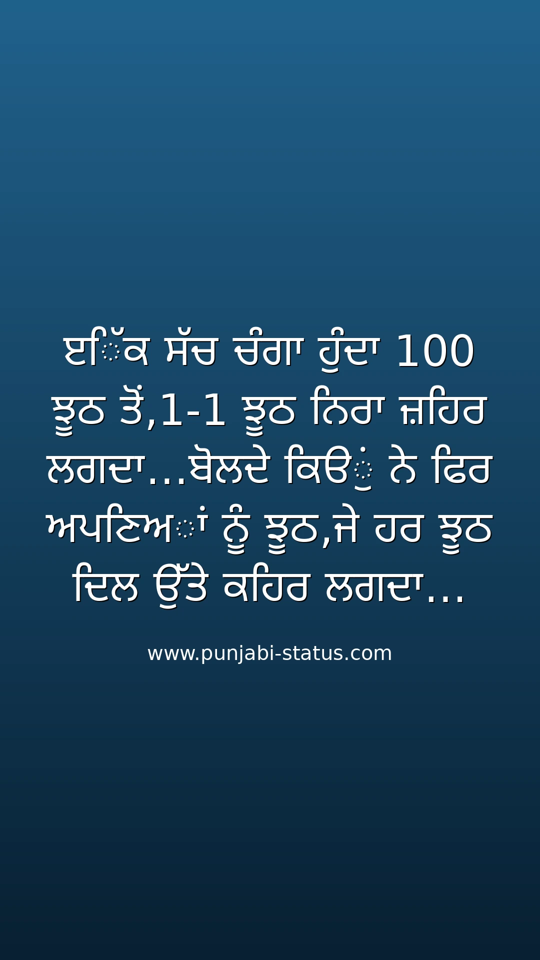 ੲਿੱਕ ਸੱਚ ਚੰਗਾ ਹੁੰਦਾ 100 ਝੂਠ ਤੋਂ,1-1 ਝੂਠ ਨਿਰਾ ਜ਼ਹਿਰ ਲਗਦਾ…ਬੋਲਦੇ ਕਿੳੁਂ ਨੇ ਫਿਰ ਅਪਣਿਅਾਂ ਨੂੰ ਝੂਠ,ਜੇ ਹਰ ਝੂਠ ਦਿਲ ਉੱਤੇ ਕਹਿਰ ਲਗਦਾ…