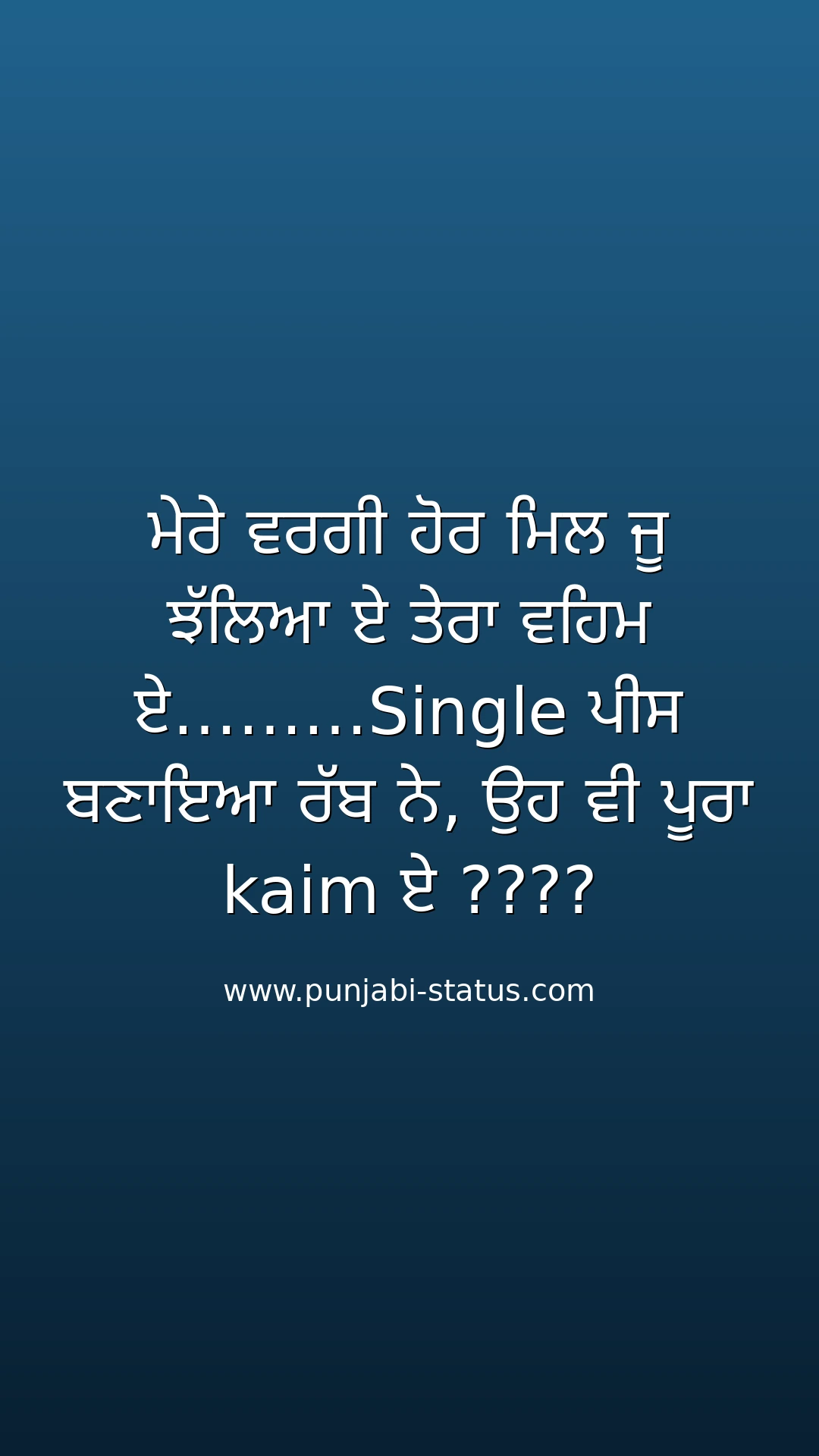 ਮੇਰੇ ਵਰਗੀ ਹੋਰ ਮਿਲ ਜੂ ਝੱਲਿਆ ਏ ਤੇਰਾ ਵਹਿਮ ਏ………Single ਪੀਸ ਬਣਾਇਆ ਰੱਬ ਨੇ, ਉਹ ਵੀ ਪੂਰਾ kaim ਏ ????