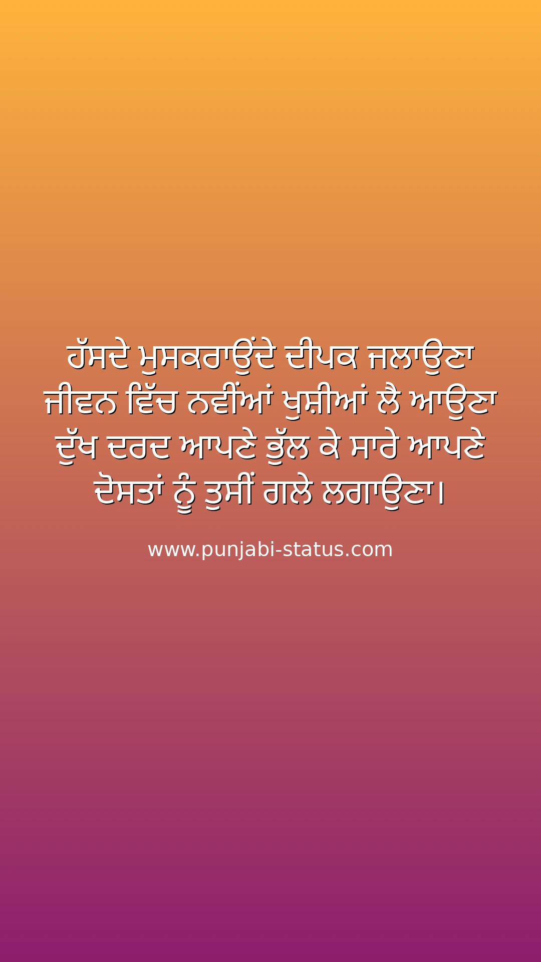 ਹੱਸਦੇ ਮੁਸਕਰਾਉਂਦੇ ਦੀਪਕ ਜਲਾਉਣਾ ਜੀਵਨ ਵਿੱਚ ਨਵੀਂਆਂ ਖੁਸ਼ੀਆਂ ਲੈ ਆਉਣਾ ਦੁੱਖ ਦਰਦ ਆਪਣੇ ਭੁੱਲ ਕੇ ਸਾਰੇ ਆਪਣੇ ਦੋਸਤਾਂ ਨੂੰ ਤੁਸੀਂ ਗਲੇ ਲਗਾਉਣਾ।