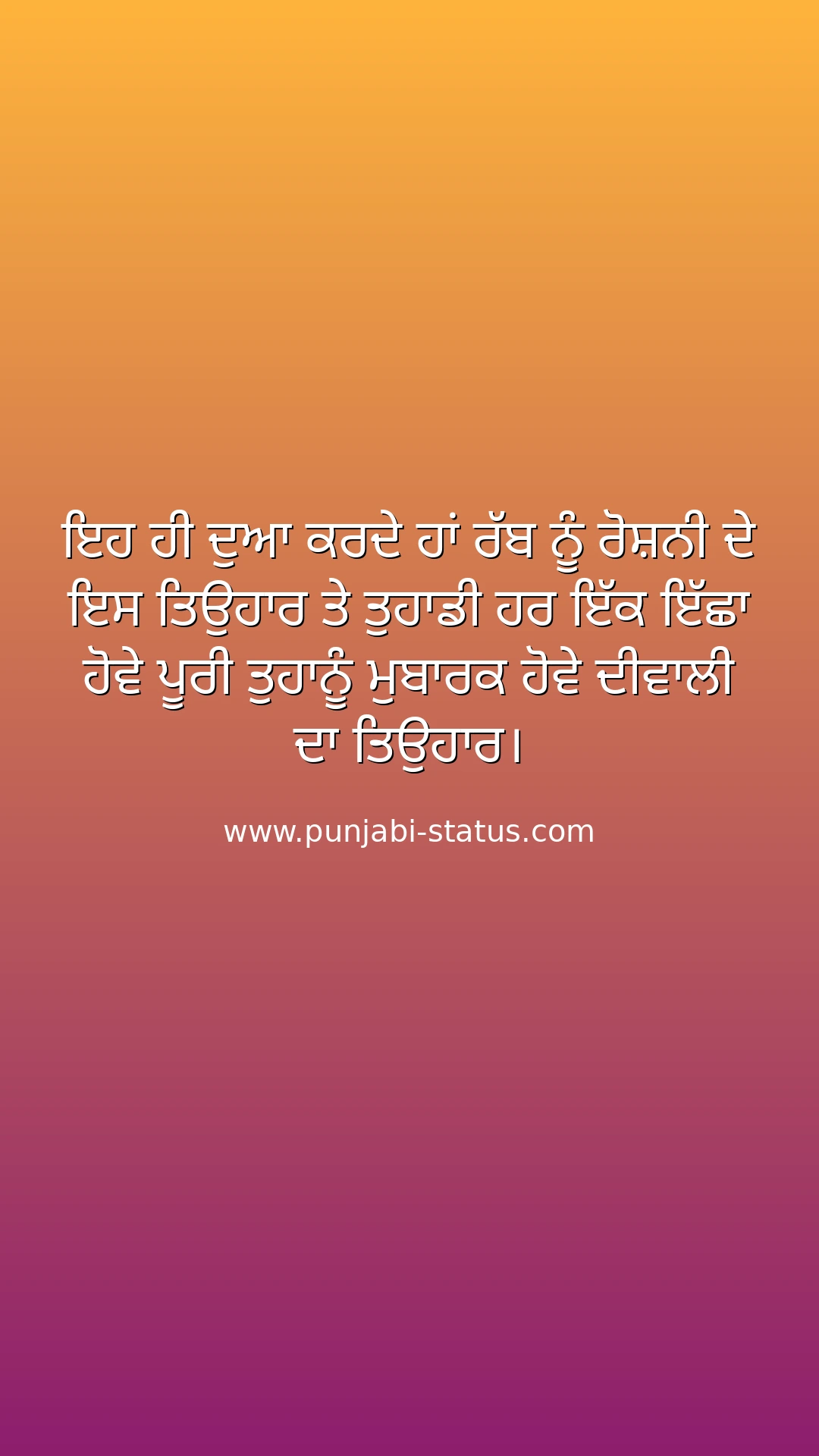 ਇਹ ਹੀ ਦੁਆ ਕਰਦੇ ਹਾਂ ਰੱਬ ਨੂੰ ਰੋਸ਼ਨੀ ਦੇ ਇਸ ਤਿਉਹਾਰ ਤੇ ਤੁਹਾਡੀ ਹਰ ਇੱਕ ਇੱਛਾ ਹੋਵੇ ਪੂਰੀ ਤੁਹਾਨੂੰ ਮੁਬਾਰਕ ਹੋਵੇ ਦੀਵਾਲੀ ਦਾ ਤਿਉਹਾਰ।