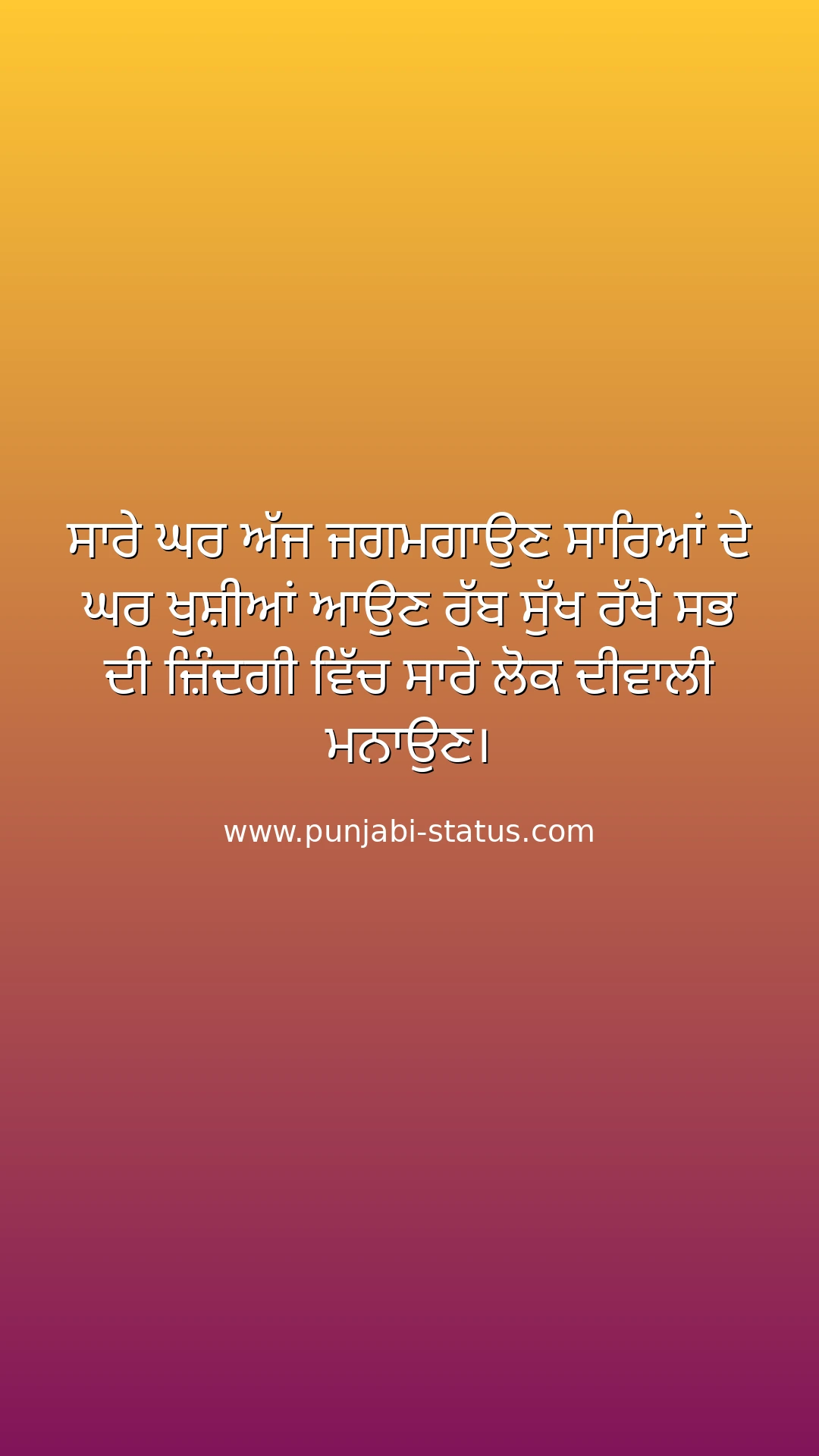 ਸਾਰੇ ਘਰ ਅੱਜ ਜਗਮਗਾਉਣ ਸਾਰਿਆਂ ਦੇ ਘਰ ਖੁਸ਼ੀਆਂ ਆਉਣ ਰੱਬ ਸੁੱਖ ਰੱਖੇ ਸਭ ਦੀ ਜ਼ਿੰਦਗੀ ਵਿੱਚ ਸਾਰੇ ਲੋਕ ਦੀਵਾਲੀ ਮਨਾਉਣ।