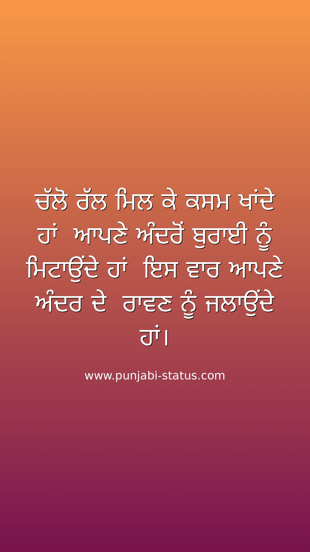 ਚੱਲੋ ਰੱਲ ਮਿਲ ਕੇ ਕਸਮ ਖਾਂਦੇ ਹਾਂ ਆਪਣੇ ਅੰਦਰੋਂ ਬੁਰਾਈ ਨੂੰ ਮਿਟਾਉਂਦੇ ਹਾਂ ਇਸ ਵਾਰ ਆਪਣੇ ਅੰਦਰ ਦੇ ਰਾਵਣ ਨੂੰ ਜਲਾਉਂਦੇ ਹਾਂ।