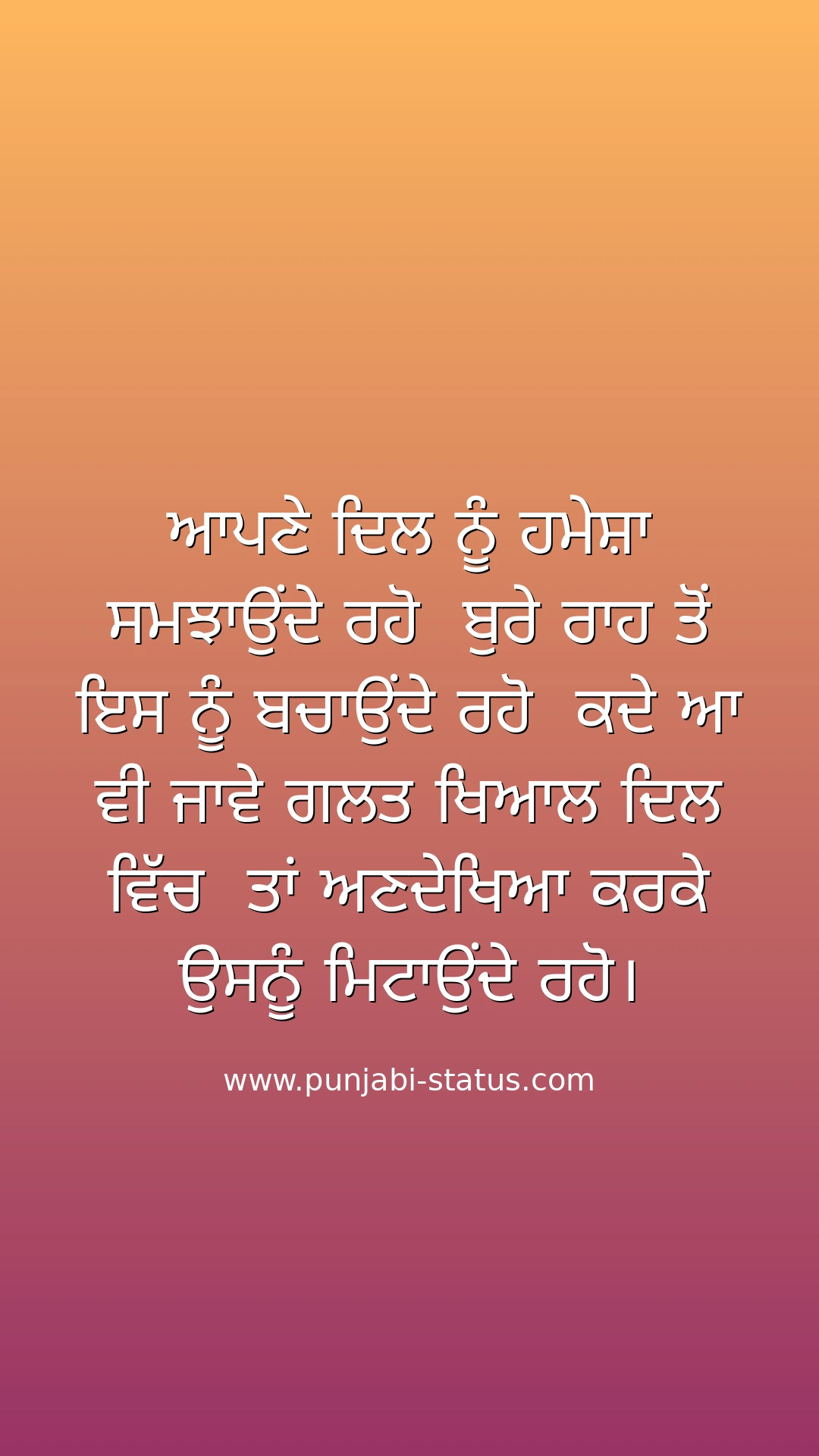 ਆਪਣੇ ਦਿਲ ਨੂੰ ਹਮੇਸ਼ਾ ਸਮਝਾਉਂਦੇ ਰਹੋ ਬੁਰੇ ਰਾਹ ਤੋਂ ਇਸ ਨੂੰ ਬਚਾਉਂਦੇ ਰਹੋ ਕਦੇ ਆ ਵੀ ਜਾਵੇ ਗਲਤ ਖਿਆਲ ਦਿਲ ਵਿੱਚ ਤਾਂ ਅਣਦੇਖਿਆ ਕਰਕੇ ਉਸਨੂੰ ਮਿਟਾਉਂਦੇ ਰਹੋ।