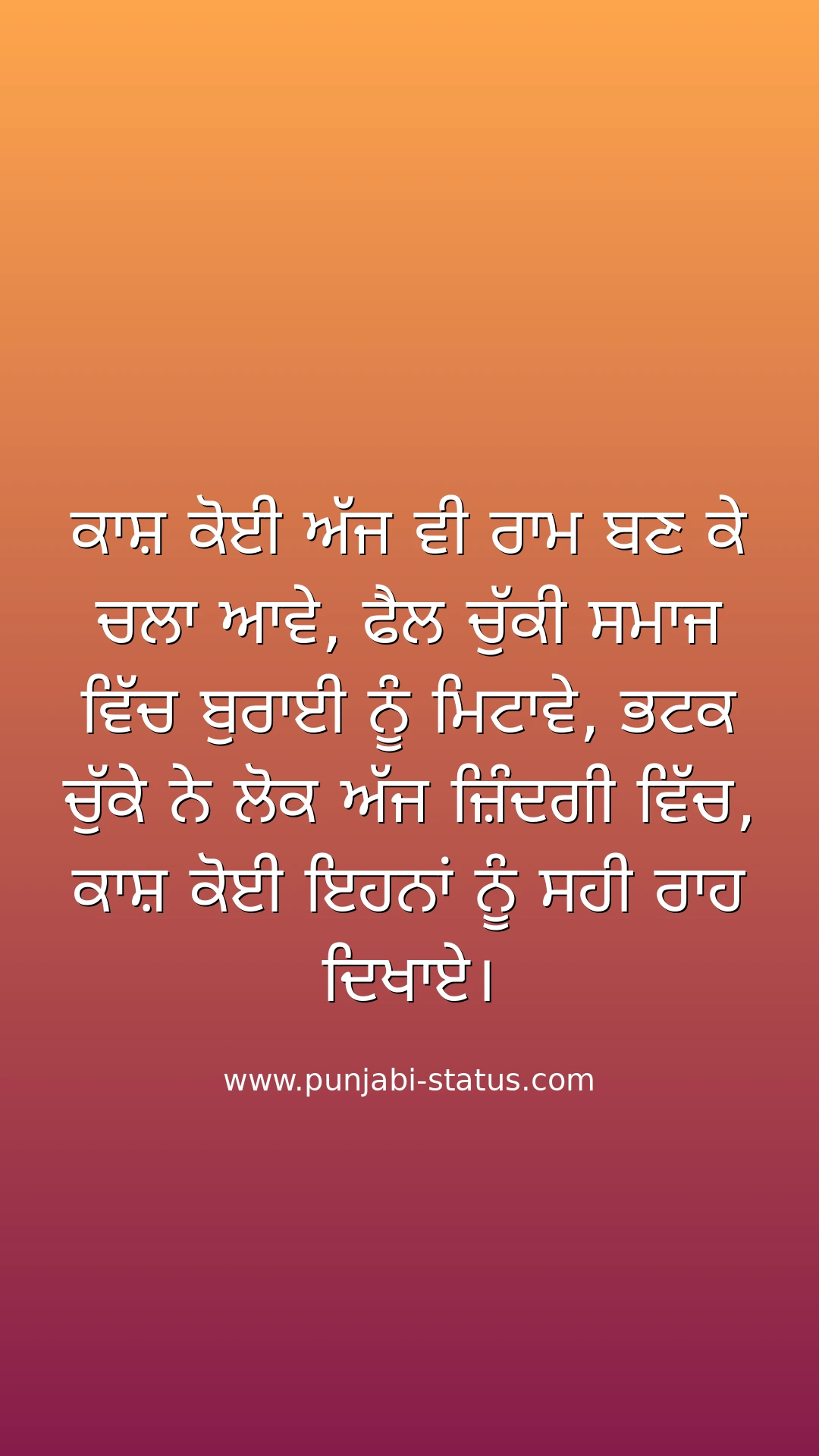 ਕਾਸ਼ ਕੋਈ ਅੱਜ ਵੀ ਰਾਮ ਬਣ ਕੇ ਚਲਾ ਆਵੇ, ਫੈਲ ਚੁੱਕੀ ਸਮਾਜ ਵਿੱਚ ਬੁਰਾਈ ਨੂੰ ਮਿਟਾਵੇ, ਭਟਕ ਚੁੱਕੇ ਨੇ ਲੋਕ ਅੱਜ ਜ਼ਿੰਦਗੀ ਵਿੱਚ, ਕਾਸ਼ ਕੋਈ ਇਹਨਾਂ ਨੂੰ ਸਹੀ ਰਾਹ ਦਿਖਾਏ।
