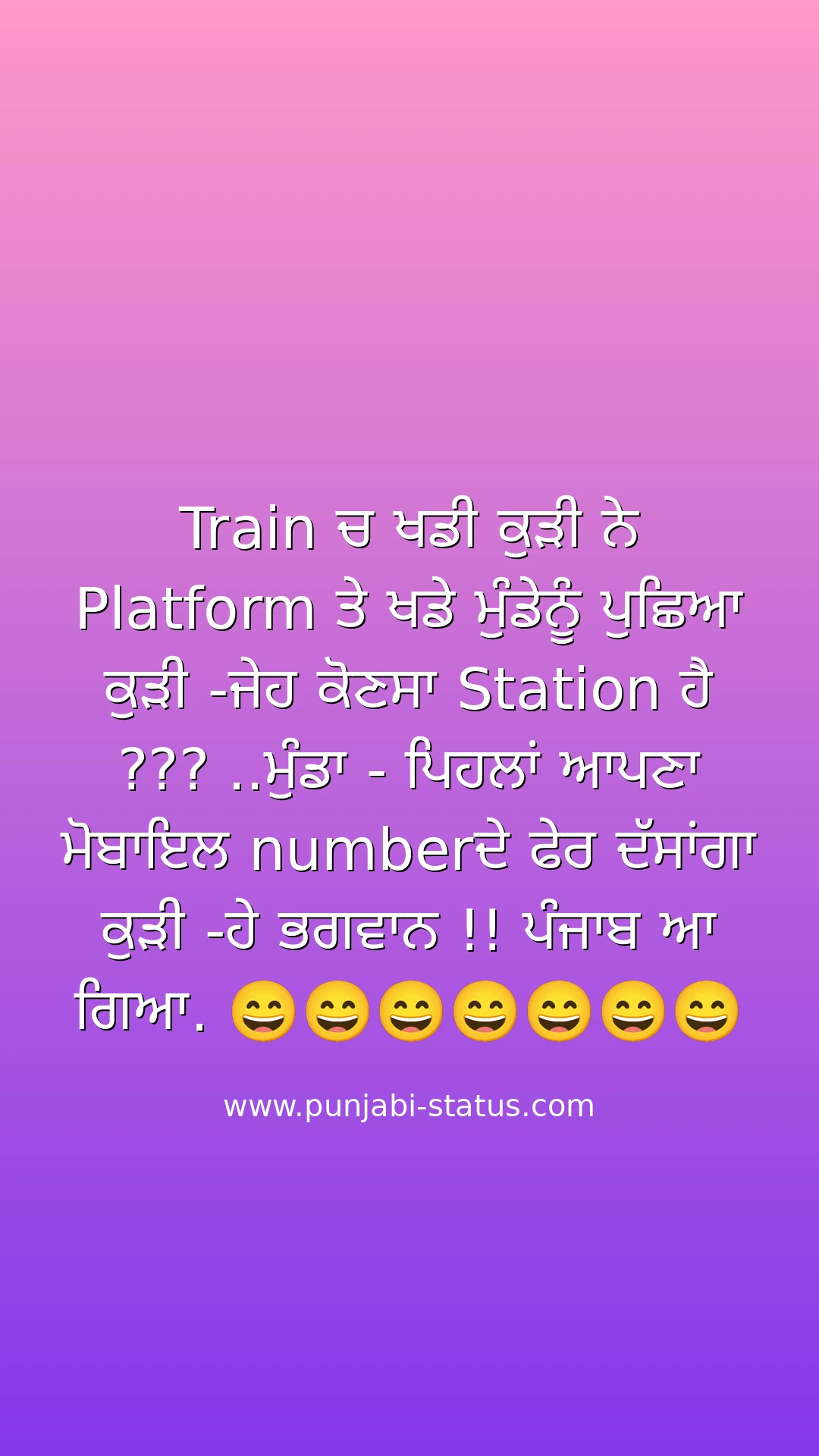 Train ਚ ਖਡੀ ਕੁੜੀ ਨੇ Platform ਤੇ ਖਡੇ ਮੁੰਡੇਨੂੰ ਪੁਛਿਆ ਕੁੜੀ -ਜੇਹ ਕੋਣਸਾ Station ਹੈ ??? ..ਮੁੰਡਾ - ਪਿਹਲਾਂ ਆਪਣਾ ਮੋਬਾਇਲ numberਦੇ ਫੇਰ ਦੱਸਾਂਗਾ ਕੁੜੀ -ਹੇ ਭਗਵਾਨ !! ਪੰਜਾਬ ਆ ਗਿਆ. 😄😄😄😄😄😄😄