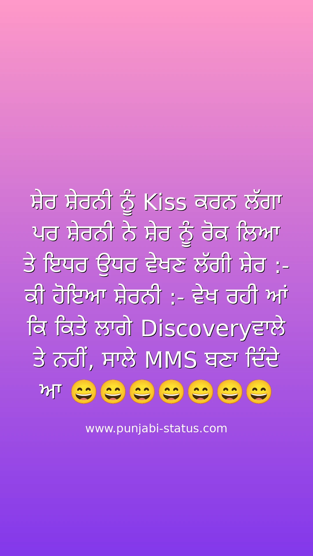 ਸ਼ੇਰ ਸ਼ੇਰਨੀ ਨੂੰ Kiss ਕਰਨ ਲੱਗਾ ਪਰ ਸ਼ੇਰਨੀ ਨੇ ਸ਼ੇਰ ਨੂੰ ਰੋਕ ਲਿਆ ਤੇ ਇਧਰ ਉਧਰ ਵੇਖਣ ਲੱਗੀ ਸ਼ੇਰ :- ਕੀ ਹੋਇਆ ਸ਼ੇਰਨੀ :- ਵੇਖ ਰਹੀ ਆਂ ਕਿ ਕਿਤੇ ਲਾਗੇ Discoveryਵਾਲੇ ਤੇ ਨਹੀਂ, ਸਾਲੇ MMS ਬਣਾ ਦਿੰਦੇ ਆ 😄😄😄😄😄😄😄