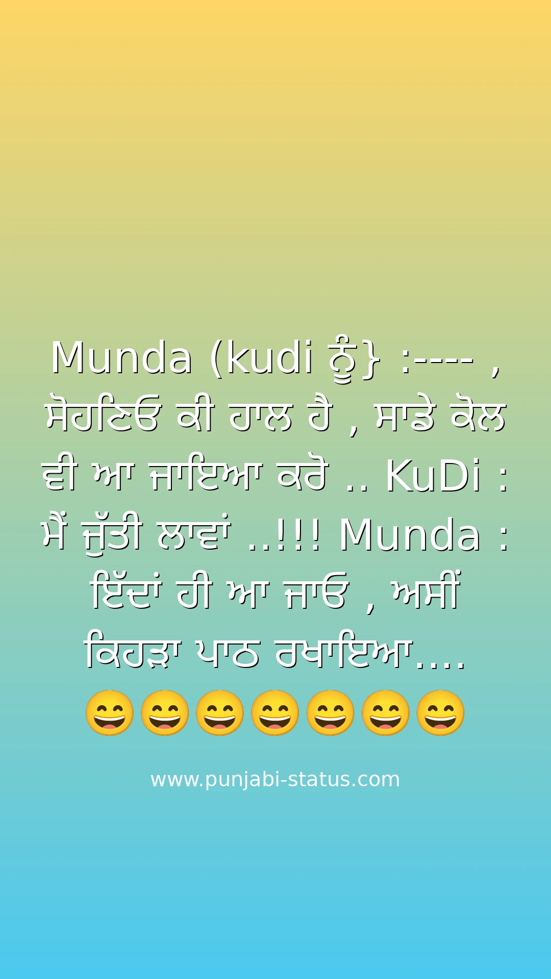 Munda (kudi ਨੂੰ} :---- , ਸੋਹਣਿਓ ਕੀ ਹਾਲ ਹੈ , ਸਾਡੇ ਕੋਲ ਵੀ ਆ ਜਾਇਆ ਕਰੋ .. KuDi : ਮੈਂ ਜੁੱਤੀ ਲਾਵਾਂ ..!!! Munda : ਇੱਦਾਂ ਹੀ ਆ ਜਾਓ , ਅਸੀਂ ਕਿਹੜਾ ਪਾਠ ਰਖਾਇਆ.... 😄😄😄😄😄😄😄