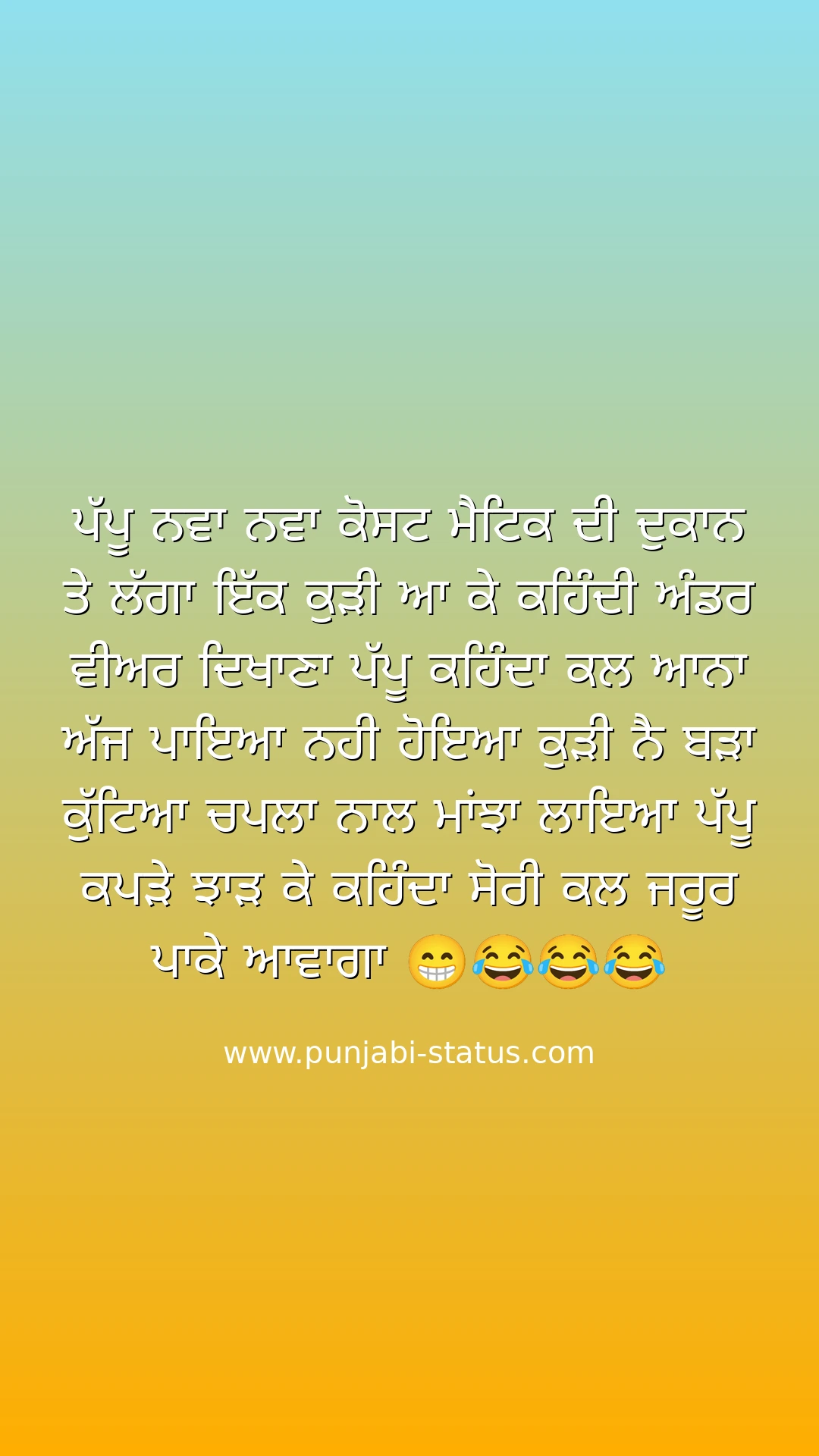 ਪੱਪੂ ਨਵਾ ਨਵਾ ਕੋਸਟ ਮੈਟਿਕ ਦੀ ਦੁਕਾਨ ਤੇ ਲੱਗਾ ਇੱਕ ਕੁੜੀ ਆ ਕੇ ਕਹਿੰਦੀ ਅੰਡਰ ਵੀਅਰ ਦਿਖਾਣਾ ਪੱਪੂ ਕਹਿੰਦਾ ਕਲ ਆਨਾ ਅੱਜ ਪਾਇਆ ਨਹੀ ਹੋਇਆ ਕੁੜੀ ਨੈ ਬੜਾ ਕੁੱਟਿਆ ਚਪਲਾ ਨਾਲ ਮਾਂਝਾ ਲਾਇਆ ਪੱਪੂ ਕਪੜੇ ਝਾੜ ਕੇ ਕਹਿੰਦਾ ਸੋਰੀ ਕਲ ਜਰੂਰ ਪਾਕੇ ਆਵਾਗਾ 😁😂😂😂
