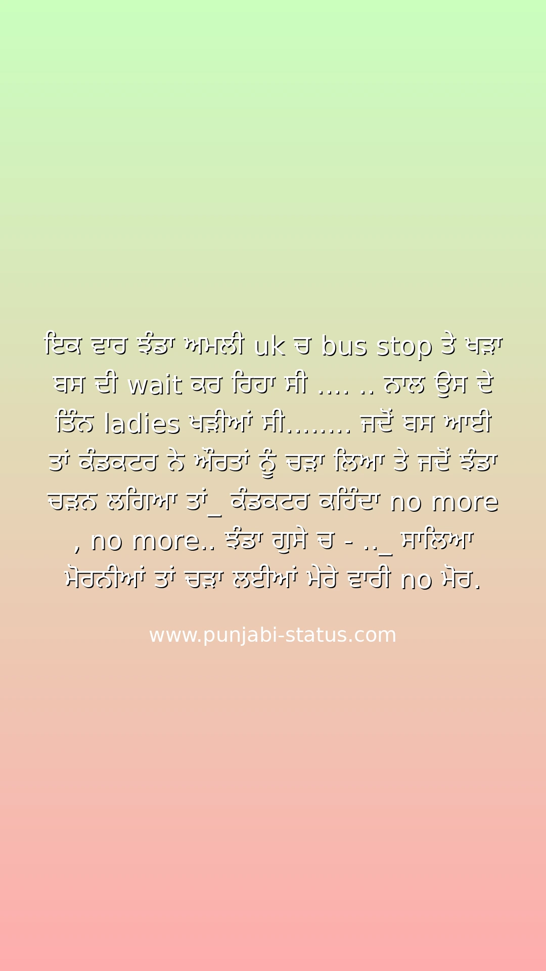 ਇਕ ਵਾਰ ਝੰਡਾ ਅਮਲੀ uk ਚ bus stop ਤੇ ਖੜਾ ਬਸ ਦੀ wait ਕਰ ਰਿਹਾ ਸੀ .... .. ਨਾਲ ਉਸ ਦੇ ਤਿੰਨ ladies ਖੜੀਆਂ ਸੀ........ ਜਦੋਂ ਬਸ ਆਈ ਤਾਂ ਕੰਡਕਟਰ ਨੇ ਔਰਤਾਂ ਨੂੰ ਚੜਾ ਲਿਆ ਤੇ ਜਦੋਂ ਝੰਡਾ ਚੜਨ ਲਗਿਆ ਤਾਂ_ ਕੰਡਕਟਰ ਕਹਿੰਦਾ no more , no more.. ਝੰਡਾ ਗੁਸੇ ਚ - .._ ਸਾਲਿਆ ਮੋਰਨੀਆਂ ਤਾਂ ਚੜਾ ਲਈਆਂ ਮੇਰੇ ਵਾਰੀ no ਮੋਰ.