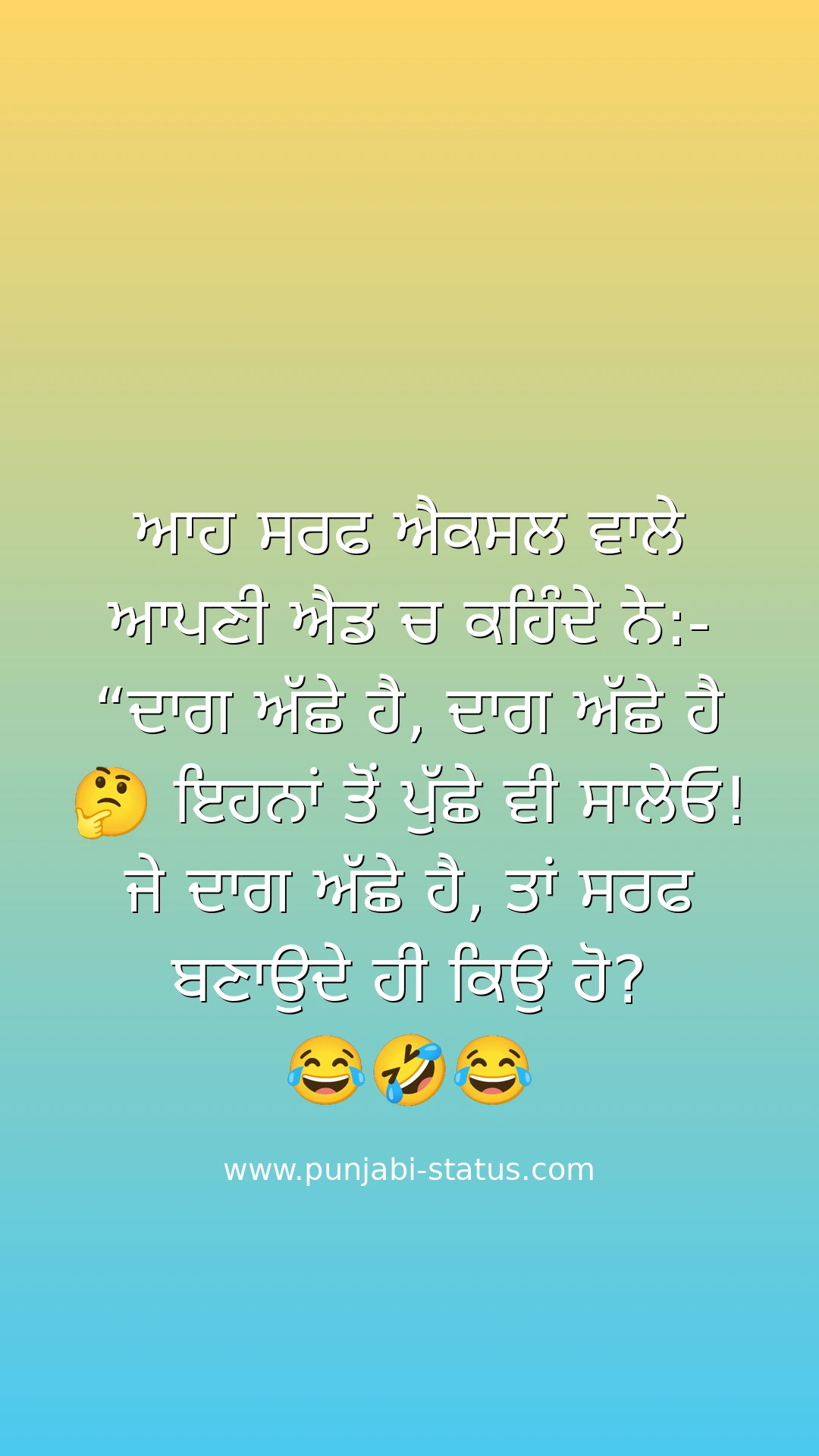 ਆਹ ਸਰਫ ਐਕਸਲ ਵਾਲੇ ਆਪਣੀ ਐਡ ਚ ਕਹਿੰਦੇ ਨੇ:- “ਦਾਗ ਅੱਛੇ ਹੈ, ਦਾਗ ਅੱਛੇ ਹੈ 🤔 ਇਹਨਾਂ ਤੋਂ ਪੁੱਛੇ ਵੀ ਸਾਲੇਓ! ਜੇ ਦਾਗ ਅੱਛੇ ਹੈ, ਤਾਂ ਸਰਫ ਬਣਾਉਦੇ ਹੀ ਕਿਉ ਹੋ? 😂🤣😂
