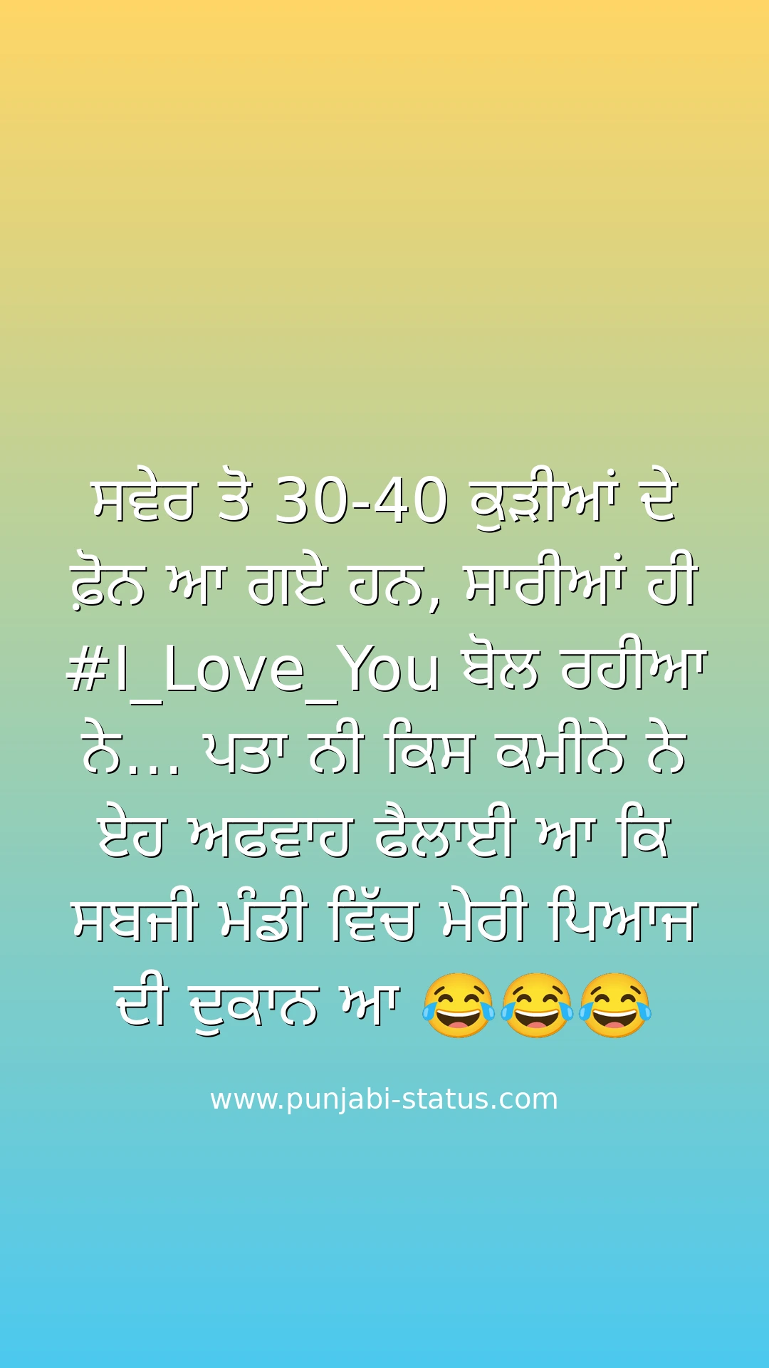 ਸਵੇਰ ਤੋ 30-40 ਕੁੜੀਆਂ ਦੇ ਫ਼ੋਨ ਆ ਗਏ ਹਨ, ਸਾਰੀਆਂ ਹੀ #I_Love_You ਬੋਲ ਰਹੀਆ ਨੇ… ਪਤਾ ਨੀ ਕਿਸ ਕਮੀਨੇ ਨੇ ਏਹ ਅਫਵਾਹ ਫੈਲਾਈ ਆ ਕਿ ਸਬਜੀ ਮੰਡੀ ਵਿੱਚ ਮੇਰੀ ਪਿਆਜ ਦੀ ਦੁਕਾਨ ਆ 😂😂😂