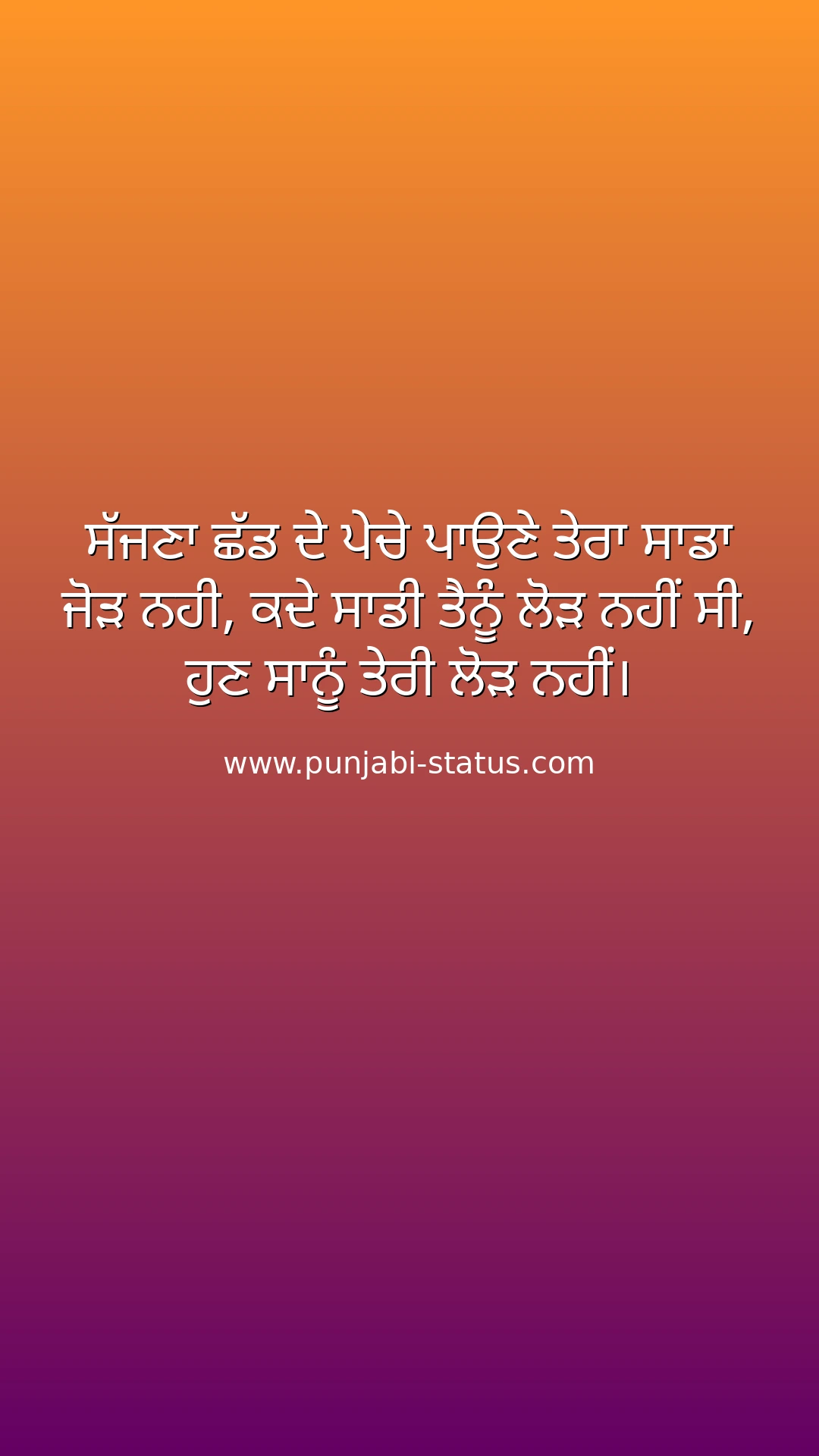 ਸੱਜਣਾ ਛੱਡ ਦੇ ਪੇਚੇ ਪਾਉਣੇ ਤੇਰਾ ਸਾਡਾ ਜੋੜ ਨਹੀ, ਕਦੇ ਸਾਡੀ ਤੈਨੂੰ ਲੋੜ ਨਹੀਂ ਸੀ, ਹੁਣ ਸਾਨੂੰ ਤੇਰੀ ਲੋੜ ਨਹੀਂ।