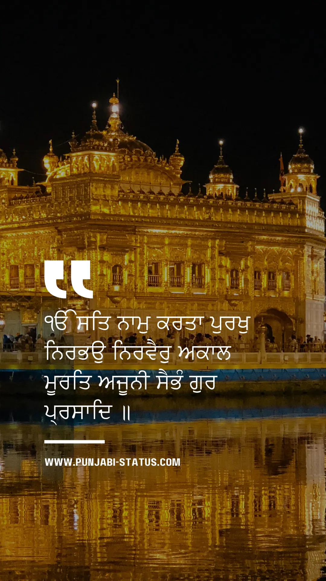ੴ ਸਤਿ ਨਾਮੁ ਕਰਤਾ ਪੁਰਖੁ ਨਿਰਭਉ ਨਿਰਵੈਰੁ ਅਕਾਲ ਮੂਰਤਿ ਅਜੂਨੀ ਸੈਭੰ ਗੁਰ ਪ੍ਰਸਾਦਿ ॥