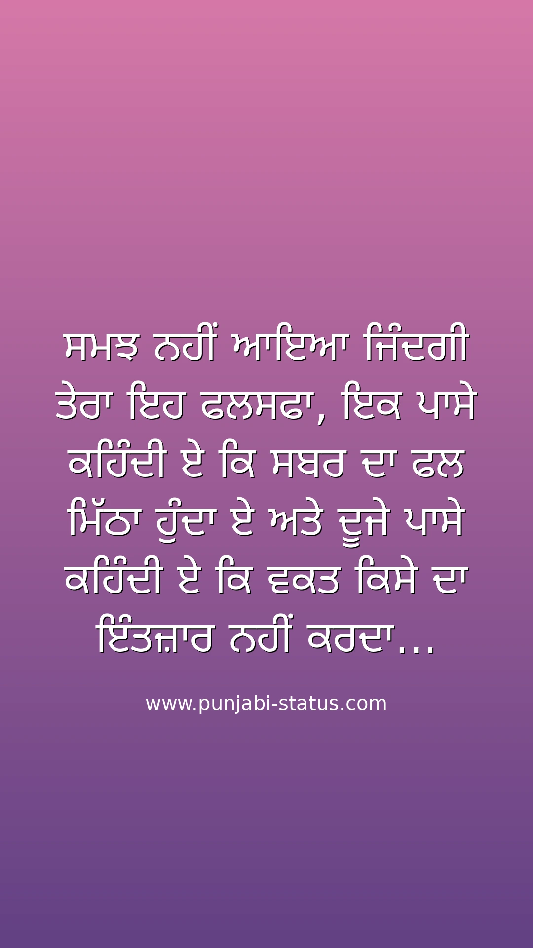 ਸਮਝ ਨਹੀਂ ਆਇਆ ਜਿੰਦਗੀ ਤੇਰਾ ਇਹ ਫਲਸਫਾ, ਇਕ ਪਾਸੇ ਕਹਿੰਦੀ ਏ ਕਿ ਸਬਰ ਦਾ ਫਲ ਮਿੱਠਾ ਹੁੰਦਾ ਏ ਅਤੇ ਦੂਜੇ ਪਾਸੇ ਕਹਿੰਦੀ ਏ ਕਿ ਵਕਤ ਕਿਸੇ ਦਾ ਇੰਤਜ਼ਾਰ ਨਹੀਂ ਕਰਦਾ…