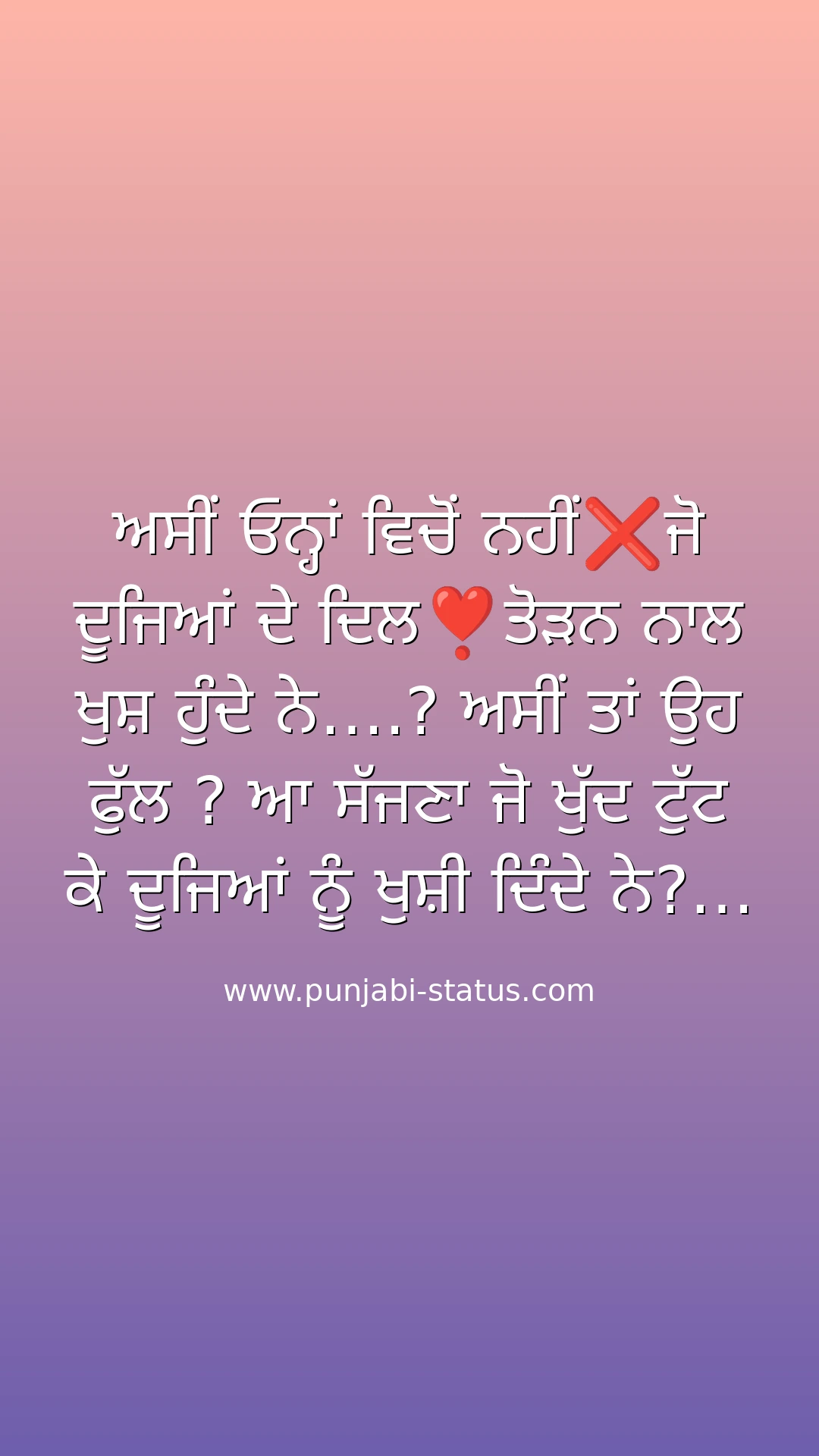 ਅਸੀਂ ਓਨ੍ਹਾਂ ਵਿਚੋਂ ਨਹੀਂ❌ਜੋ ਦੂਜਿਆਂ ਦੇ ਦਿਲ❣ਤੋੜਨ ਨਾਲ ਖੁਸ਼ ਹੁੰਦੇ ਨੇ….? ਅਸੀਂ ਤਾਂ ਉਹ ਫੁੱਲ ? ਆ ਸੱਜਣਾ ਜੋ ਖੁੱਦ ਟੁੱਟ ਕੇ ਦੂਜਿਆਂ ਨੂੰ ਖੁਸ਼ੀ ਦਿੰਦੇ ਨੇ?…