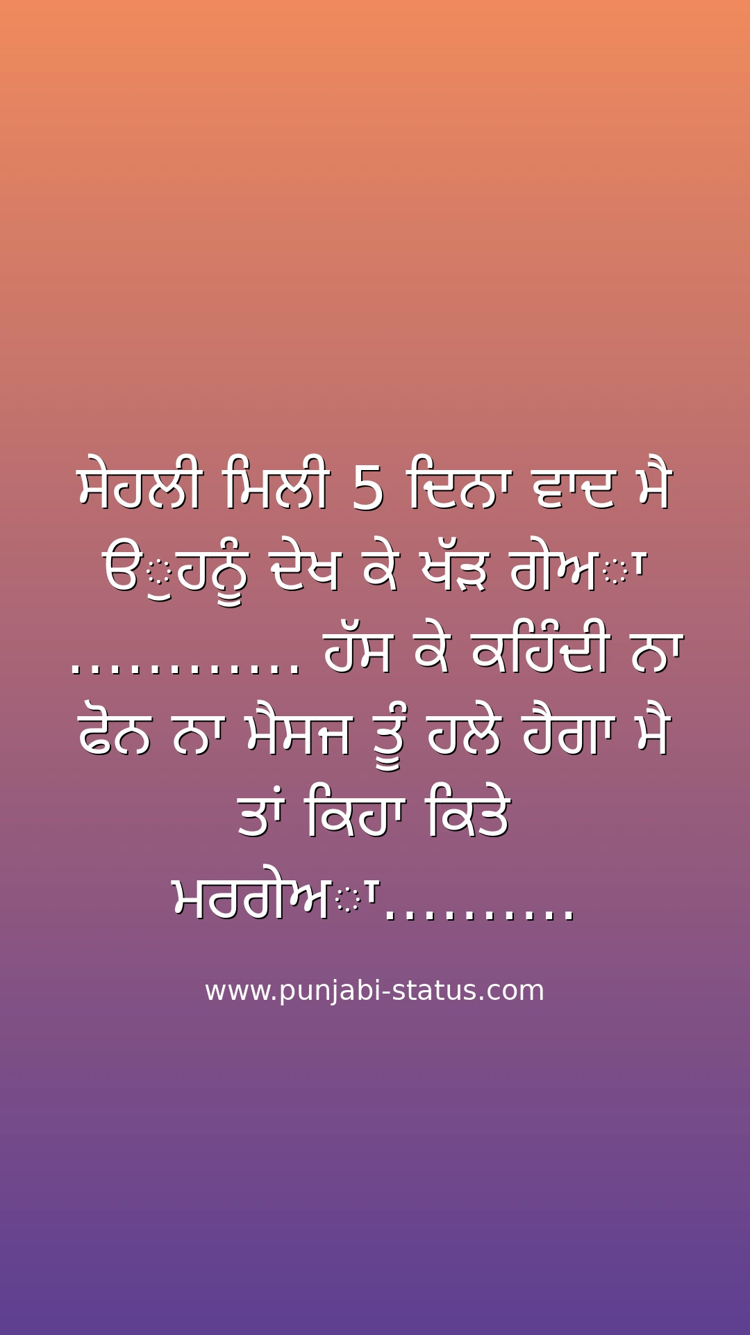 ਸੇਹਲੀ ਮਿਲੀ 5 ਦਿਨਾ ਵਾਦ ਮੈ ੳੁਹਨੂੰ ਦੇਖ ਕੇ ਖੱੜ ਗੇਅਾ ………… ਹੱਸ ਕੇ ਕਹਿੰਦੀ ਨਾ ਫੋਨ ਨਾ ਮੈਸਜ ਤੂੰ ਹਲੇ ਹੈਗਾ ਮੈ ਤਾਂ ਕਿਹਾ ਕਿਤੇ ਮਰਗੇਅਾ……….