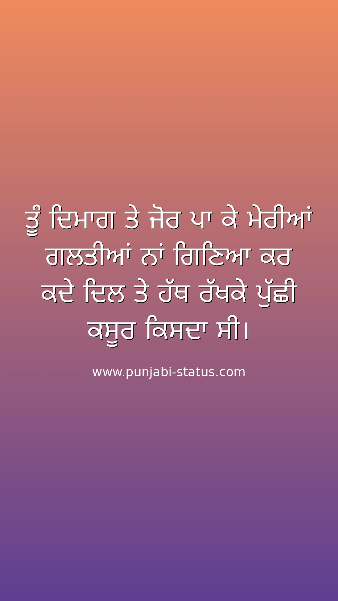 ਤੂੰ ਦਿਮਾਗ ਤੇ ਜੋਰ ਪਾ ਕੇ ਮੇਰੀਆਂ ਗਲਤੀਆਂ ਨਾਂ ਗਿਣਿਆ ਕਰ ਕਦੇ ਦਿਲ ਤੇ ਹੱਥ ਰੱਖਕੇ ਪੁੱਛੀ ਕਸੂਰ ਕਿਸਦਾ ਸੀ।