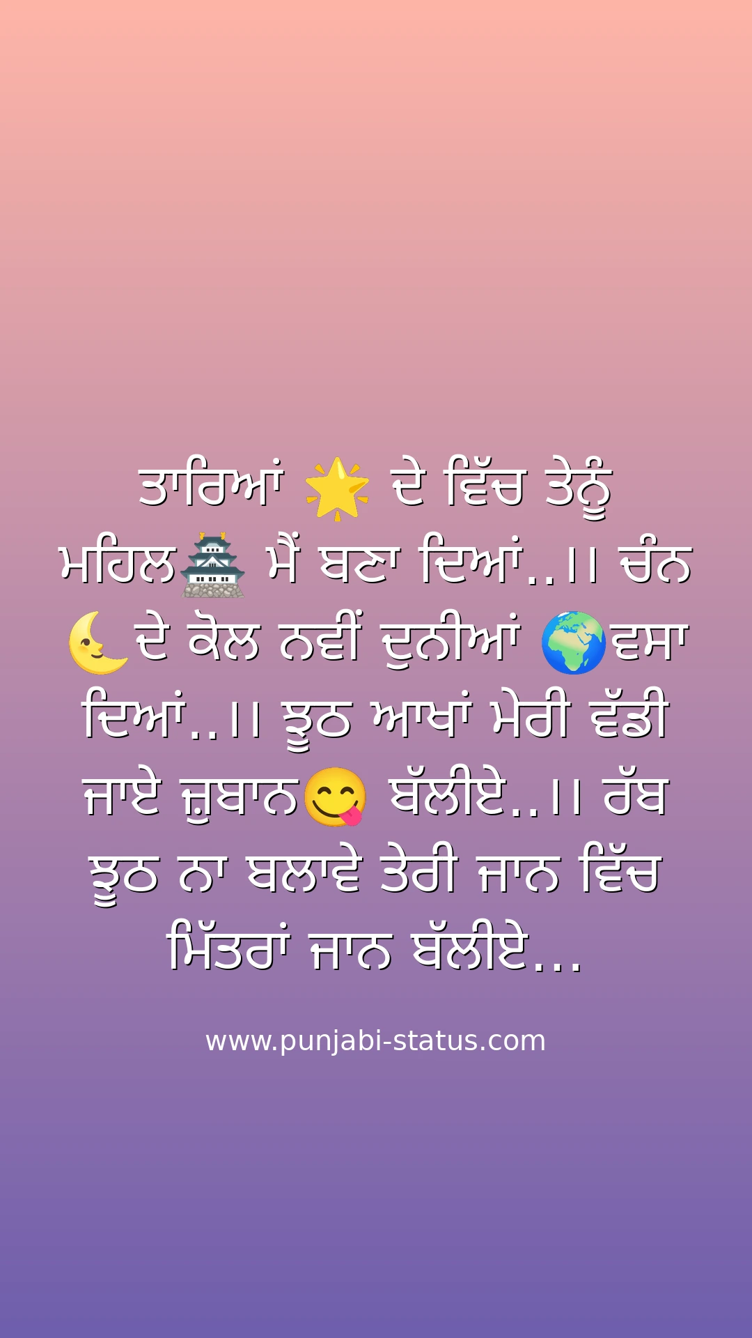 ਤਾਰਿਆਂ 🌟 ਦੇ ਵਿੱਚ ਤੇਨੂੰ ਮਹਿਲ🏯 ਮੈਂ ਬਣਾ ਦਿਆਂ..।। ਚੰਨ 🌜ਦੇ ਕੋਲ ਨਵੀਂ ਦੁਨੀਆਂ 🌍ਵਸਾ ਦਿਆਂ..।। ਝੂਠ ਆਖਾਂ ਮੇਰੀ ਵੱਡੀ ਜਾਏ ਜ਼ੁਬਾਨ😋 ਬੱਲੀਏ..।। ਰੱਬ ਝੂਠ ਨਾ ਬਲਾਵੇ ਤੇਰੀ ਜਾਨ ਵਿੱਚ ਮਿੱਤਰਾਂ ਜਾਨ ਬੱਲੀਏ…