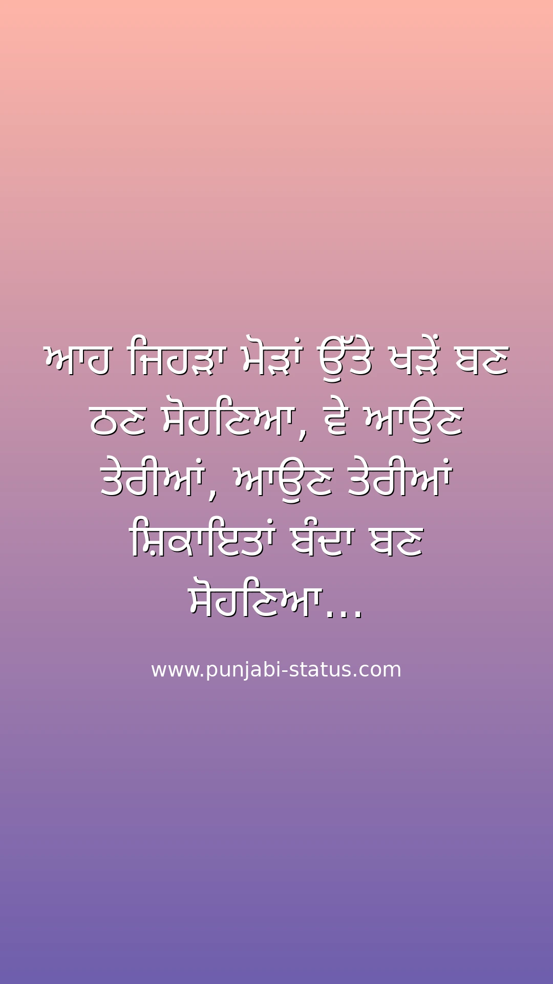 ਆਹ ਜਿਹੜਾ ਮੋੜਾਂ ਉੱਤੇ ਖੜੇਂ ਬਣ ਠਣ ਸੋਹਣਿਆ, ਵੇ ਆਉਣ ਤੇਰੀਆਂ, ਆਉਣ ਤੇਰੀਆਂ ਸ਼ਿਕਾਇਤਾਂ ਬੰਦਾ ਬਣ ਸੋਹਣਿਆ...