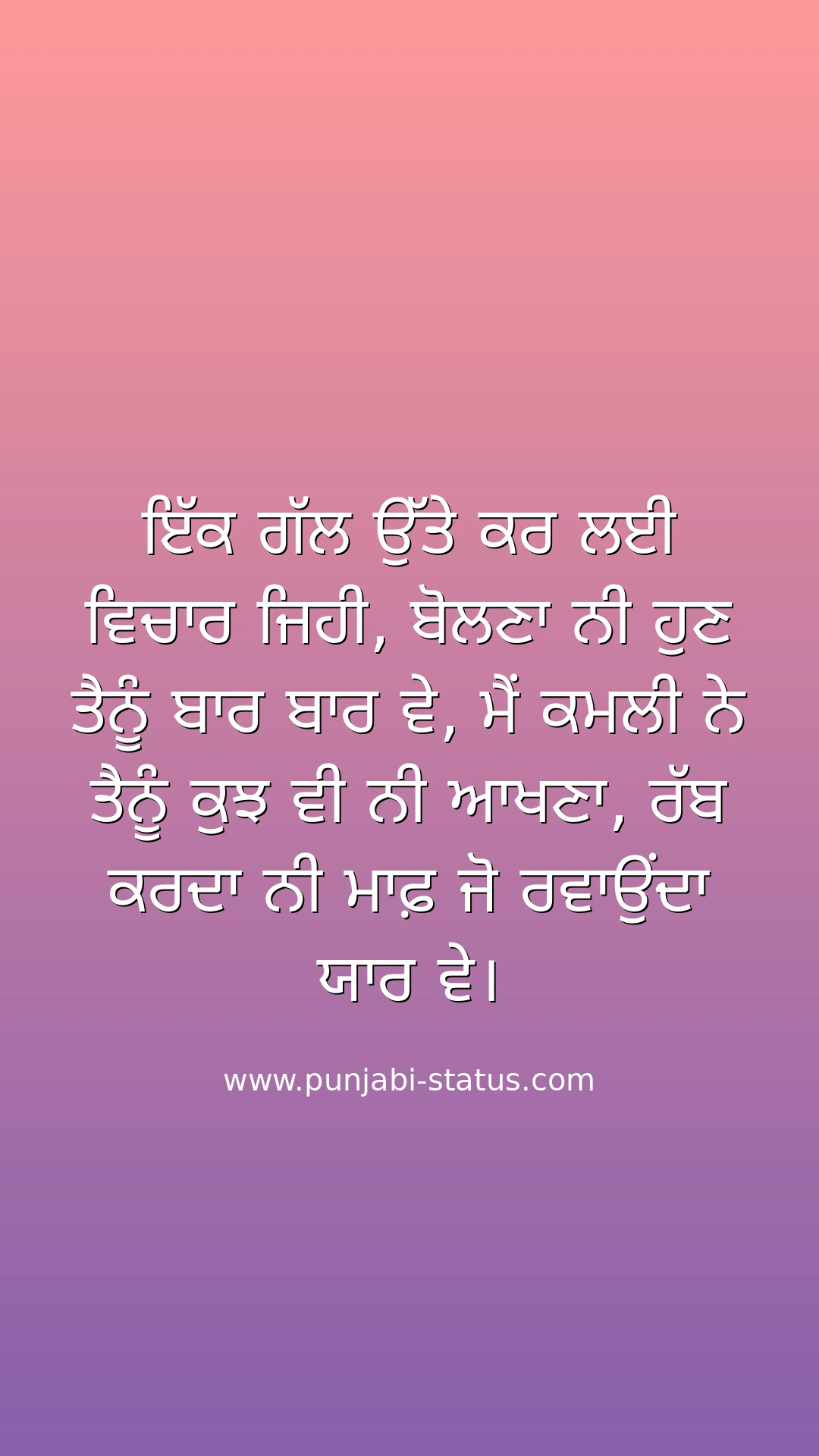 ਇੱਕ ਗੱਲ ਉੱਤੇ ਕਰ ਲਈ ਵਿਚਾਰ ਜਿਹੀ, ਬੋਲਣਾ ਨੀ ਹੁਣ ਤੈਨੂੰ ਬਾਰ ਬਾਰ ਵੇ, ਮੈਂ ਕਮਲੀ ਨੇ ਤੈਨੂੰ ਕੁਝ ਵੀ ਨੀ ਆਖਣਾ, ਰੱਬ ਕਰਦਾ ਨੀ ਮਾਫ਼ ਜੋ ਰਵਾਉਂਦਾ ਯਾਰ ਵੇ।